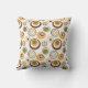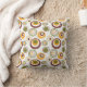 Dieses Kissen hat ein modernes Design von konzentrischen Kreisen in grün, orange und braun auf weißem Hintergrund.