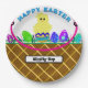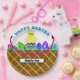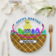 Weißbrauner Osterkorb mit rosa und grünem Ostergras und rosa Körbchen. Glückliche Ostertypografie in Himmelblau. Niedliches gelbes Küken aus bunt gestreiftem Ei geschlüpft. Dekorierte Eier. Hippity Hop Typografie in schwarz in schwarz-weißem Rechteck. Original Artwork Design © TamiraZDesign.