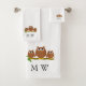 Bath towel set, consisting of a face cloth, hand towel and bath towel with an owl design. You can customise this bath towel set with any text of your choice. Should you require any help with customising then contact us through the message link on this page. Owl design bathroom towel set