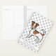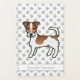 Desteis originelle Cartoon-Illustration eines bezaubernden Weiß- und Bräunlich / Braun und Weiß Jack Russell Terrier Rasse Hund. Es gibt auch einen personalisierbaren Textbereich für einen Namen oder Titel. Der Hintergrund hat ein hellgraues Muster von Hundepfauendrucken.