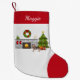 Desteis originelle Cartoon-Illustration einer niedlichen glatten Haar Schokoladenbraun und Bräunen Dapfelfarbe Farbe Dackel züchten Hund. Der Hund befindet sich in einem Festsaal mit Kamin und vielen Weihnachtsdekorationen, darunter ein grüner Weihnachtsbaum, einige rote Strümpfe und ein Kranz mit rotem Bogen. Es gibt auch einen personalisierbaren Textbereich für einen Namen. Oben und unten sind rot, während die Hintergrundfarbe insgesamt sehr hellgrau ist.