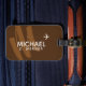 Ein cooles und modernes Gepäckanhänger, personalisiert mit dem Namen und dem Anfang des Reisenden auf braunem Hintergrund
