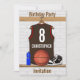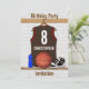 Basketballgeburtstagseinladungen mit einem kundengerechten braunen und roten Basketball Jersey, der in einem Sport-Umkleideraum mit einem Basketball, Basketballturnschuhen und einer Wasserflasche hängt. Der Sport Jersey ist mit Ihrer eigenen Zahl und Namen völlig kundengerecht, wirklich einzigartige personalisierte Sportbasketball-Geburtstags-Party Einladungen für den Basketballspieler oder den Basketballfan zu schaffen.