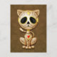 Dieses hübsche, braune Kätzchen-Design ist mit Wirbel und Punktmustern dekoriert. Gelbe Blume-Pedale umkreisen die reinen schwarzen Augen in der Tradition des Tages der toten Zuckerschädel. Die Katze sitzt da unten und sieht nach vorn mit ihrem Schwanz im Hintergrund. Der übergroße Kopf sitzt auf einem winzigen Körper, der ein spielerisches, Cartoon-ähnliches Aussehen schafft. Ein Fünf-Punkte-Stern sitzt in der Mitte der Stirn des Kätzchens, während in der Mitte der Brust ein leuchtend rotes und gelbes Herz auftaucht. Diese niedliche Katze ist ein lustiges und stilvolles Design, inspiriert durch die wunderschönen Muster des Tages der toten Zuckerschädel.