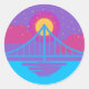 Eine Brücke, die in Rot-Rosa-Tönen gegen einen traumhaften lila Nachthimmel leuchtet, ein leuchtender Vollmond scheint hinter treibenden Wolken, während seine Reflektion über das ruhige Wasser unten schimmert.