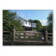 Holzschienen einer Kanalbrücke in Omihachiman, mit traditionellem japanischem Gebäude im Hintergrund.