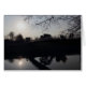 Ein Foto einer Fußgängerbrücke über einen Fluss gegen die sonnige Nachmittagssonne und den hellen Himmel mit Silhouetten von Menschen, die über die Brücke gehen und die Sonne reflektiert sich im Wasser. In Bute Park, Cardiff, Wales, Vereinigtes Königreich