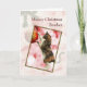 Eine lustige Weihnachtskarte, die eine auf den Hinterbeinen stehende Kalico-Katze zeigt und mit einer roten Balldekoration auf einem Weihnachtsbaum spielt. In der Karte ist ein Bild einer Katze, die eine Weihnachtsmannmütze trägt. Eine lustige Karte, die Sie an Freunde oder Familie senden können, die Katzen lieben.