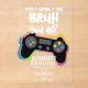 A teen boys "Bruh" themed birthday invitation using cool typography. A custom kids neon gaming "pizza, gaming and cake " teenage boys birthday gamer invitation design perfect for any teens gaming birthday party theme. Customize this "Bruh" gamer birthday invitation with your own text and make it your own!