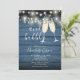 Die elegante Brunch- und Brautduscheinladung mit Champagnergläsern und dem prächtigen Schriftnamen personalisiert mit den Informationen in schicken Schriften auf blauem rustikalem Holzhintergrund. Entwickelt von Thisisnotme©