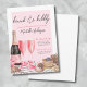 Niedlicher rosa Brunch und Bubbly Champagne Bridal Dusche. Feiern Sie die zukünftige Braut mit diesem charmanten und eleganten "Brunch & Bubbly"-Design, das sich perfekt eignet, um ihren besonderen Tag stilvoll zu würdigen. Die Vorderseite weist einen sauberen, weißen Hintergrund mit einem rot-rosa Rechteck auf, das einen weichen weißen Rahmen erzeugt. Am unteren links Rand stehen zwei rosa Champagnergläser, eine rosa und schwarze Flasche mit Bogen und Konfetti sowie eine köstliche Auswahl an Leckereien zum Frühstück, darunter Pfannkuchen, Croissant, Zimtwürfel und Kekse auf einem grauen und weißen Handtuch. Der Text enthält "Brunch & Bubbly" oben in stylischen rosa und dunkelgrauen Schriftart, gefolgt von "Bitte schließen Sie uns an, um die Braut zu ehren" mit Platz für den Namen der Braut. Diese Einladung eignet sich perfekt für eine festliche morgendliche Ansammlung und ist vollständig anpassbar, sodass Sie die Farben, den Text und die Details an Ihre Sehkraft anpassen können. Es ist als gedruckte oder digitale Datei erhältlich und eignet sich hervorragend zum Set eines unvergesslichen Brautparty.
