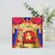 Royal Prince Baby Dusche, Boy Red Crown Blue and Gold, Yellow Toy Teddy Bär und Red Chair Throne. Niedlicher Brünetter Baby Boy. Elegante Babydusche, Pärchen Baby Duschboy und Rot-Blau Vorhänge Drapes Tassels Einladung. Vintage Babydusche.