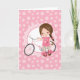 This design features a cute brunette girl with her pink bicycle. On pink and white cute scallop accent background.