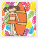 Ein brünett haariges Mädchen mit einem Orangensurfbrett vor einem Hintergrund von multicolors tropischen Blätter auf Aufklebern, die zu unseren Brünetten Girl Surfer Einladungen und Porto-Briefmarke passen.