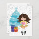 Diese bezaubernde Irish Dance Themenkarte bietet einen niedlichen brünetten irischen Tänzer in einem gelben, rosa, grünen und orangefarbenen Solo-Tanz in einem Winterwunderland mit Schnee, Weihnachtsbaum und Geschenken.