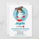Die Einladung dieses Mädchens zeigt ein hübsches Brünettes Mädchen, das sich in Pedikürwasser mit Blasen überall die Füße taucht. Türkis, rot und weiß.