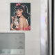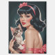 Mit ihrem ravenschwarzen Haar in sanften Wellen, mit einem zarten rosa Bogen geschmückt, verkörpert sie zeitlose Gnade und Charme. Ihre tiefen grünen Augen, ihre strahlende Farbe und die klassischen roten Lippen erinnern an den Glamour des alten Hollywoods, während das seidig rosa Kleid, das mit funkelnden Verzierungen und einem dramatischen Bogen detailliert ist, eine Touch der Eleganz schafft. Das Kätzchen mit seinen großen grünen Augen und weich gestreiftem Fell steigert die Wärme und Unschuld der Komposition. Set vor einem reichen, dunklen Hintergrund, verbindet dieses Kunstwerk Sinnlichkeit, Nostalgie und Zärtlichkeit, was es zu einer perfekten Wahl für Liebhaber der Vintagen Ästhetik, des felinen Charmes und der klassischen Schönheit macht.