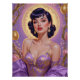 Eine faszinierende Abbildung eines brünetten Buttons in einem luxuriösen lila Gewand mit aufwändigen goldenen Blumenmustern, Set vor einem traumhaften lila Hintergrund. Sie trägt eleganten Perl- und Goldschmuck, wobei ihre Retrowellen einen strahlenden Ausdruck bilden. Umgeben von blühenden Ästen und goldenen Ostereiern verbindet dieses Stück Vintagen Glamour mit festlichem Charme.