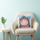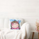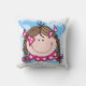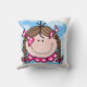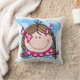 Ein braunes, haariges Mädchen mit Braiden und einem rosa, blühenden Kragen und rosa Schleifen im Haar auf einem blauen Kissen.