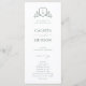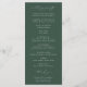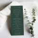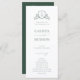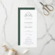 BRUNSWICK WAPPEN, Hochzeitsprogramm. Die Einrichtung, die elegante grüne Typografie, die botanische Vegetation und das blumengeschmückte Wappen vorne mit weißer Typografie und die grüne Hintergrundfarbe auf der Rückseite.