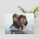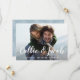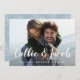 Eine elegante Hochzeitskarte Save the Date Postkarte, die für Ihr Lieblings-Foto in horizontaler oder landschaftsorientierter Vollblut-Verlobung konzipiert ist. Ihre Namen erscheinen als weißes Textüberlagerungsbild in einem modernen, handgeschriebenen Pinselkalligraphieskript. Personalisieren Sie Ihren Hochzeitstag und Ihre Hochzeitslocation unten. Karten kehren zu einem subtilen botanischen Muster in weichem Blau mit Platz, um Ihre Hochzeitswebsite url oder alle zusätzlichen Informationen, die Sie wählen. Sie können die hintere Farbe ändern, indem Sie auf Anpassen/Anpassen klicken und dann die neue Hintergrundfarbe entweder aus der Palette oder durch Eingabe eines Farbhex-Codes auswählen.