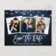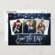 Modernes Pinselskript, rustikales blaues Holz und String-Leuchten, Save the Date Verlobung Paar 3 Foto Postkarte