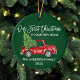 Modern Brush Script Unsere ersten Weihnachten in unserem New Zuhause Ornament beinhaltet Watercolor Vintag Red Truck mit Weihnachtsbaum. Grüner Hintergrund des Waldes.