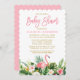 Moderne rosa Pinselschrift, Watercolor Tropical Floral Baby Shower Einladungskarte mit rosa Flamingo. Goldene Schrift