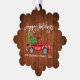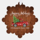 Modernes Pinselskript Wasserfarbe Vintager roter LKW mit Weihnachtsbaum - Happy Holidays Ornament. Rustikaler Holzdruck Hintergrund. Das ist eine Karte und ein Ornament.