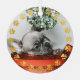 Laden Sie zwei Fotos von Jungen und Jungtieren für diese moderne Weihnachtsbaumschablone hoch. Die Vorderseite besteht aus einem simulierten, metallisch gebürsteten Radial-Metallrahmen mit einem Rundrahmen aus Messing, mit 14k goldsimulierten Glitzer-Pfotenausschnitten und einem anpassbaren Namen in einer Schriftzeichen, der eine vollständige Bildabdeckung ermöglicht und einen Rahmen von stumm simulierten metallisch antiken goldenen Pfoten hat.