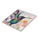 A brushstroke-style design featuring a vibrant hummingbird adorned with a spotted bow tie, its wings fluttering as it hovers gracefully above a nest fille