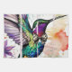 A brushstroke-style design featuring a vibrant hummingbird adorned with a spotted bow tie, its wings fluttering as it hovers gracefully above a nest fille