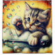 Tauchen Sie ein in den verspielten Charme dieses hübschen Kunstwerks mit einem Kätzchen, das ein Whirlpool genießt. Das Kätzchen mit einem schläfrigen Ausdruck greift spielerisch mit einer Pfote inmitten zahlreicher Blasen auf. Der warme orange bis gelbe Farbverlauf verleiht der Szene ein gemütliches und einladendes Gefühl. Dieses skurrile Design erweckt den Spaß und die Entspannung der Badzeit und ist somit perfekt geeignet, um jedem Raum eine Touch von Kultur und Wärme zu verleihen.