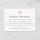 Schieben Sie diese kleinen Karten in Ihre Babydusche-Einladungen, wenn Sie Bücher anstelle von Karten anfordern. Das Design zeichnet sich durch eine schicke schwarze Schrift mit einer kleinen, rot-rosa Herz-Abbildung oben aus. Ein süßes Gedicht erklärt die Buchanforderung: "Nur eine Anfrage, wir hoffen, es ist nicht schwer // Bitte bringen Sie ein Buch anstelle einer Karte // Durch die Unterzeichnung Ihres Namens werden wir uns erinnern und teilen // Ihr süßes Geschenk, auch wenn Sie nicht da sind." Personalisieren Sie mit dem Ehrengast und dem Duschdatum am unteren Ende.