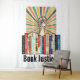 Protest Bücher mit diesem Bild zu verbieten, das ein Regal verbotener Bücher enthält, eine erhabene Faust, einen Ausbruch von Farbrochen und die Worte "Buche Gerechtigkeit" in einem Retro-Schriftart. Von einem Rand reich blauer. Sieht toll aus!