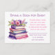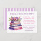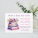 Schicken Sie diese kleine, süße "Buch für Baby"-Karte in Ihre Baby-Dusche-Einladung, um Babyduschgäste zu ermutigen, ein Buch für das Baby mitzubringen und eine Notiz zu schreiben. Die Vorderseite ist hübsch gestreift und hat einen Aquarellstapel mit rosa und lila Blumen.