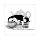 Eine niedliche schwarz-weiße Katze, die auf einem Haufen Bücher mit grüner Teekanne und einer Tasse Tee schläft.