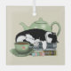 Eine niedliche, schwarz-weiße Tuxedo-Katze, die auf einem Stapel Bücher schläft, hinter der sich eine grüne Teekanne und vorne eine Tasse Tee befindet