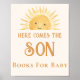 Dieses Babyduschenzeichen mit gelben Aquarellen, die die Sonne lächeln, und Terrakotta-Typografie. Original Wasserfarbe © Michele Davies.