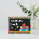 Eine niedliche Postkarte, um die Schüler der Grundschule wieder in die Schule aufzunehmen. Auf der Vorderseite können Sie die Meldung "Willkommen zurück!" auf einer Imitat-Tafel lesen. Sie können auch einige Bücher und einen roten Apfel sehen. Auf der Rückseite befindet sich die Textvorlage. Ändern Sie einfach die Informationen über Datum und Uhrzeit des ersten Schultages . Es gibt auch Zeilen, um den Namen und die Zimmernummer des Lehrers hinzuzufügen. © ArianeC Illustrationen