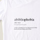 Einfaches, modernes und minimalistisches T - Shirt in Schwarz-Weiß-Wörterbuchdefinitionsdesign. Mit den Worten "Abibliophobie, Fake-Substantiv. Die Angst, dem Lesematerial auszugehen. Oft gelöst durch den Kauf von mehr Büchern."