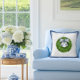 Das Wreath Bow Kissen ist eine charmante Mischung aus Klassik und Gemütlichkeit, perfekt, um Ihrem Zuhause einen Hauch von grandmillennialer Eleganz zu verleihen. Es zeigt einen wunderschön detaillierten Wasserfarben-Buchsbaumkranz, der mit einer weichen blauen und grünen Blumenschleife geschmückt ist und von einem raffinierten blauen Kontrastrahmen umgeben ist. Die Rückseite zeigt ein blau-weißes Gittermuster für eine frische, cottage-inspirierte Note. Ob auf einer Bank, einem Bett oder einem Sofa gestylt, bringt dieses Kissen zeitlose Schönheit und garteninspirierten Charme in Ihren Raum.