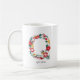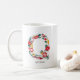 Whimsikale, festliche und elegante Blumenbriefe Tasse mit Blume in Rot, Grün, Gold und Grau. Personalisieren Sie diese durch Hinzufügen von Namen oder einer kurzen Wortgruppe. Andere Farben und Buchstaben sind verfügbar.