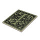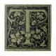 Charmanter Zierbrief T Initialmonogramm. Typografie im kalligraphischen Stil. William Morris erster Brief in Schwarz über Vintagen Avocado grün Vintages Buch Auskleidung mit cremefarbenen Ginkgo Biloba-Blätter.