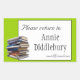 Dieses Design hat ein ausgeschnittenes Foto von Hardcover-Büchern. Der Text lautet "Bitte kehren Sie zu: Ihr Name, your@email". Der gesamte Text ist leicht personalisiert. Es ist möglich, dass Sie gewollt haben, es zu verschieben oder zu verkleinern, und das kann einfach gemacht werden - klicken Sie einfach auf den Button "Anpassen". Sie können auch die Hintergrundfarbe ändern.