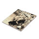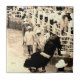 Cowboys in Hüten und Regenmänteln sehen, wie ein Wettkämpfer aus dem Tor kommt und an einem regnerischen Tag auf einem Rodeo einen Bullen reitet. Sepia drucken.