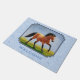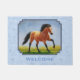Wildes Buchenpferd, das über ein grasbedecktes schlichte galoppiert. Akzentriert mit einem hübschen Himmelblau gemusterten Hintergrund.