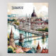Capture the magic of the Pearl of the Danube with this detailed Budapest Hungary cityscape vintage watercolor ink sketch illustration. Featuring the magnificent Hungarian Parliament Building and the iconic Széchenyi Chain Bridge spanning the blue Danube River, this artwork celebrates the heart of Eastern Europe. The design blends a vintage travel poster style with a soft watercolor aesthetic, making it a perfect travel souvenir or Europe wall art.