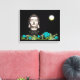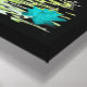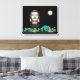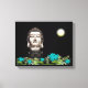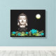 Eine silberne Buddha-Kopfstatue, die auf schwarzem Wasser mit schwimmenden türkisfarbenen Lotus-Blume und grünen Lilienpolstern reflektiert. Schwarzer Hintergrund.
