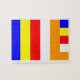 Die buddhistische Fahne ist eine Fahne, die im späten 19. Jahrhundert entworfen wurde, um den Buddhismus zu symbolisieren und universell zu vertreten. Es wird von Buddhisten auf der ganzen Welt benutzt. Die sechs senkrechten Fahnenbänder repräsentieren die sechs Farben der Aura, die Buddhisten von der Leiche des Buddha herleiten, als er Erleuchtung erlangte: Blau (Nila): Liebenswürdigkeit, Frieden und universelles Mitgefühl Gelb (Pita): Der Mittelweg - Extreme vermeiden, Leere Rot (Lohita): Die Segnungen der Praxis - Leistung, Weisheit, Tugend, Glück und Würde (Odata): Die Reinheit von Dharma - die zur Befreiung außerhalb der Zeit oder des Raumes Orange (Manjesta) führt: Die Lehren des Buddha - Weisheit Die sechste vertikale Band, die Fliege, besteht aus einer Kombination von rechteckigen Bändern der fünf anderen Farben und stellt eine Verbindung der anderen fünf Farben im Aura-Spektrum dar. Diese zusammengesetzte Farbe wird als Pabbhassara ("Essenz des Lichts") bezeichnet. Globe Trotters ist auf die Idiosynkratische Bildsprache aus der ganzen Welt spezialisiert. Hier finden Sie einzigartige Grußkarten, Postkarten, Poster, Mousepads und mehr.